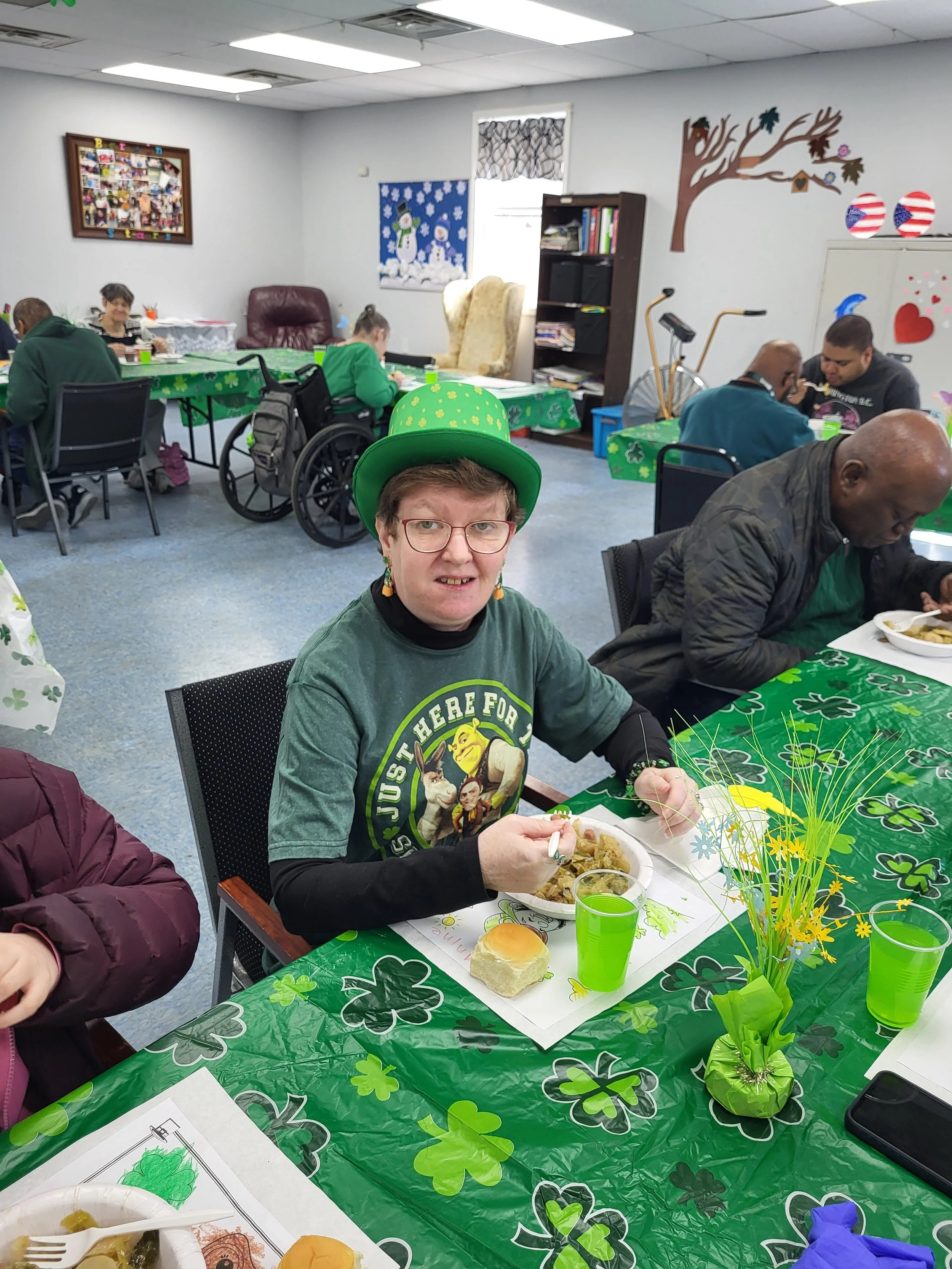A special shoutout goes to the talented kitchen team at Three Little Birds Café, who worked with our consumers to create a truly festive menu. Together, they baked a beautiful sheet cake that was as delicious as it was eye-catching. The creativity didn’t stop there—guests enjoyed pasta salad topped with shamrock-shaped pepperoni and cheese, along with desserts delicately dusted with gold for an extra touch of magic. It was a perfect example of collaboration, creativity, and pride in every detail.